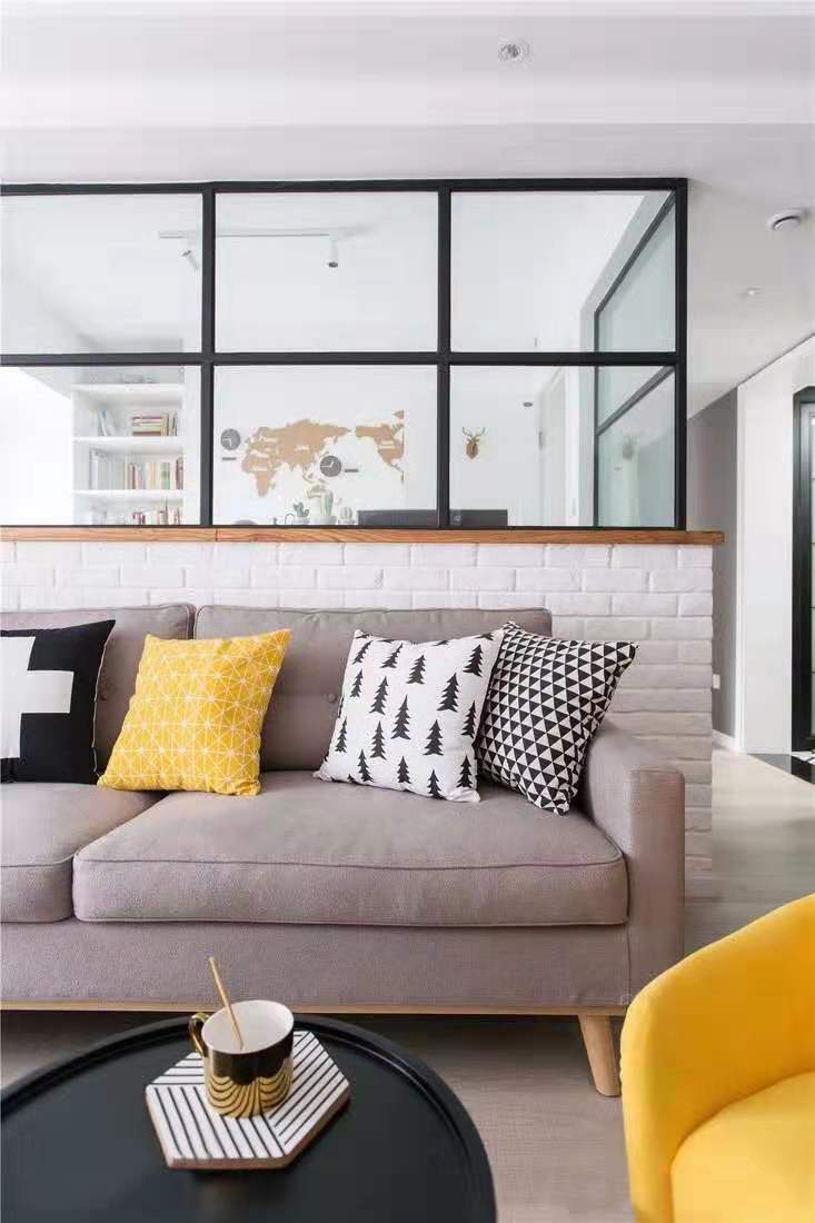 客厅,设计师采用黑框玻璃的设计,在增加整个空间通透感的同时,又可提升书房的采光。