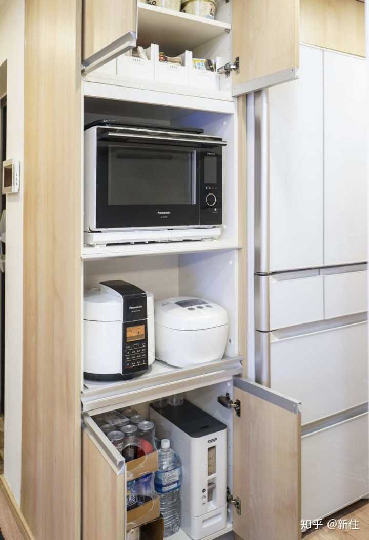 如果厨房空间足够,定制高柜是不错的方式,可以把常用小家电都收纳起来不说,还非常方便使用。